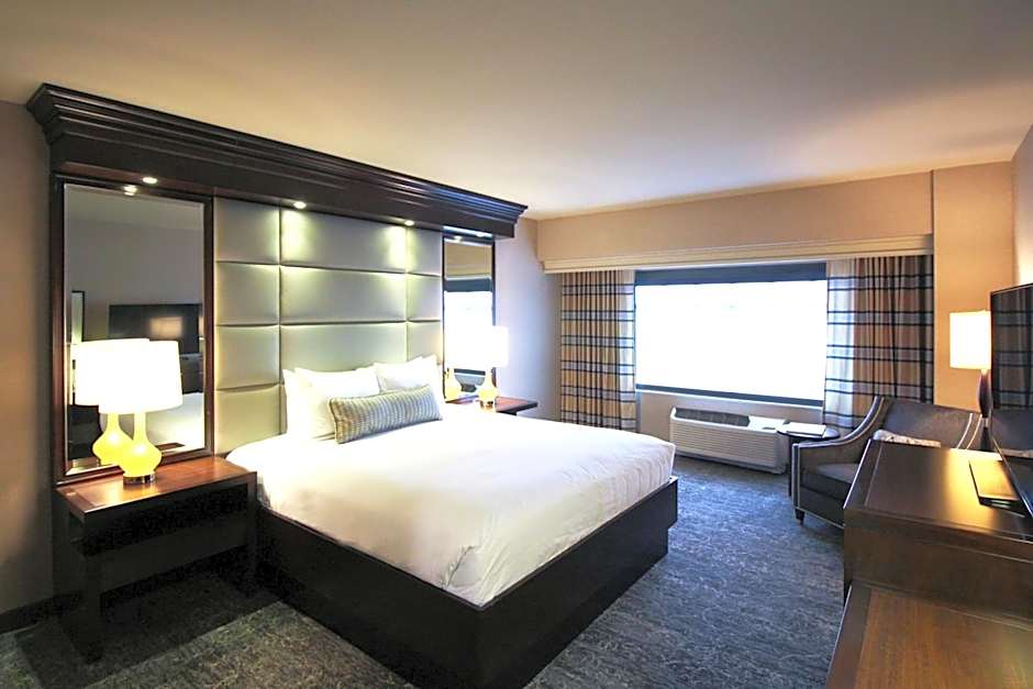 This modern and spacious king suite features a flat-screen TV, a desk, a seating area with a sofa, and a private bathroom with a spa bath.